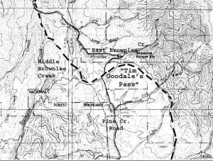 On some land plats the surveyors identified the older Goodale trail route by inscribing various descriptive names. On several plats, it is simply called the “old trail,” going NNW, and following the entire route marked from plat to plat. On one section of the road it was called, “Trail to Pine Valley [Oregon],” on the next going northerly, a 1901 plat, it was recorded as “From Cambridge to Ruthburg.” Ruthburg was a mining town (Map. p. 4, top left), now called Heath, along the Goodale route on Brownlee Creek-NW corner of T17N, R4W. On the next 1901 plat the road was called, “Road from Cambridge to Brownlee’s Ferry,” and on the last, “Brownlee Creek Trail!” By that time, among the working surveyors, the route must have lost its first identity with Goodale, but one 1876 description of the road did name the top of the grade going over near Brownlee Creek, “Tim Goodall’s [sic] pass” (Map, p. 36, top left). Horton called the area back down at the crossing of the Payette River, “Tim Goodwell’s [sic] crossing.” [5]Willis H. Pettit, Joseph Perrault, and Ernest G. Eagleson, Surveyor Generals, Survey Plats, (BLM). Various plats following NW from the Cambridge area, obtained in July 2004 from the Boise BLM office; … Continue reading