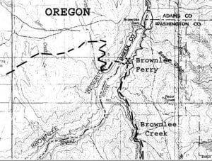 According to the satellite information available today showing most of a trail that follows very closely to that early Brownlee Ferry road, plotted on the old land plats, much of this route could still be mapped and marked. (It was found and traveled in May 2005, and ruts were quite evident.) The present improved road going NW along Pine Creek, running parallel from 1 to 2 miles on the southwest side of the older road, was not built for many years. On the later plats of the 1890s, the Pine Creek road was called “Road to Salubria.”